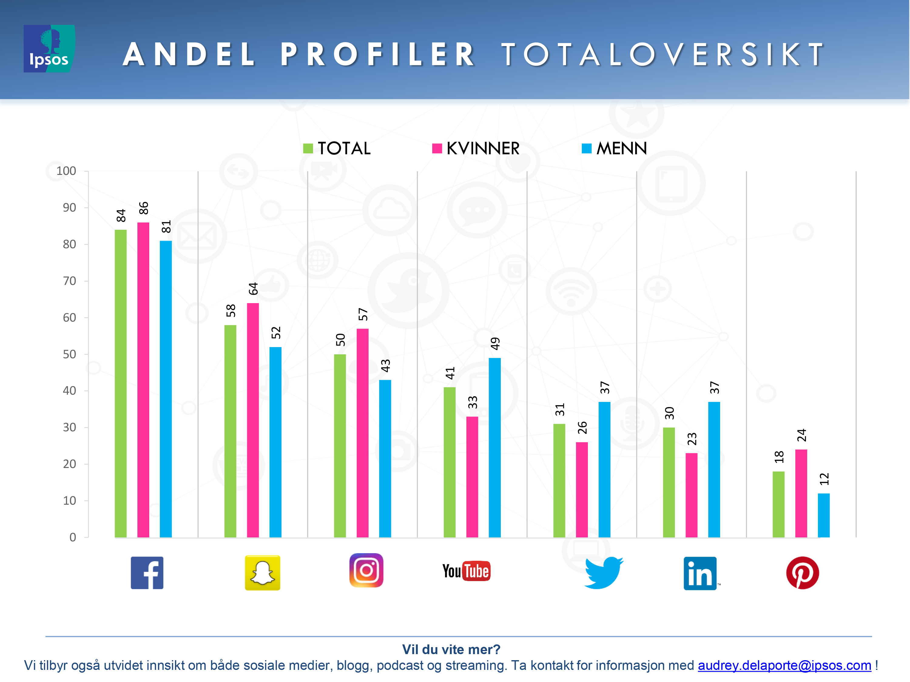 Oppdaterte tall for Facebook, Instagram, LinkedIn, Snapchat, Twitter, Pinterest og YouTube. Sjekk infographics for andel profiler, bruksfrekvens og utvikling….